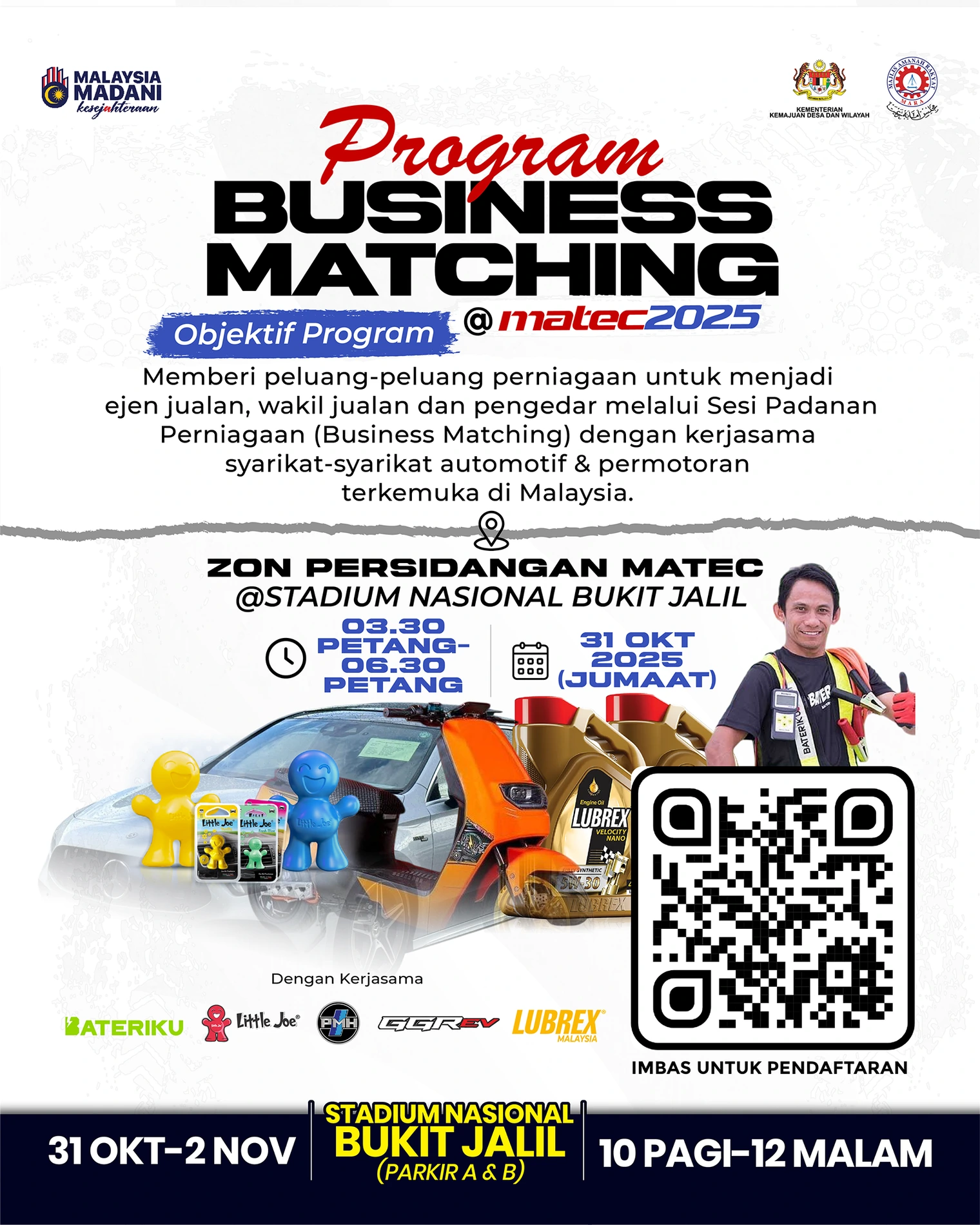 Presenting the inaugural MARA Automotive Ecosystem exhibition, a groundbreaking event that brings a fresh wave of excitement to Malaysians nationwide. MATEC2025 is more than just a conventional showcase — it's a dynamic platform brimming with opportunities, catering not only to entrepreneurs but also to visitors from all walks of life. Prepare to explore innovative ideas, connect with industry experts, and uncover endless possibilities in this one-of-a-kind experience.